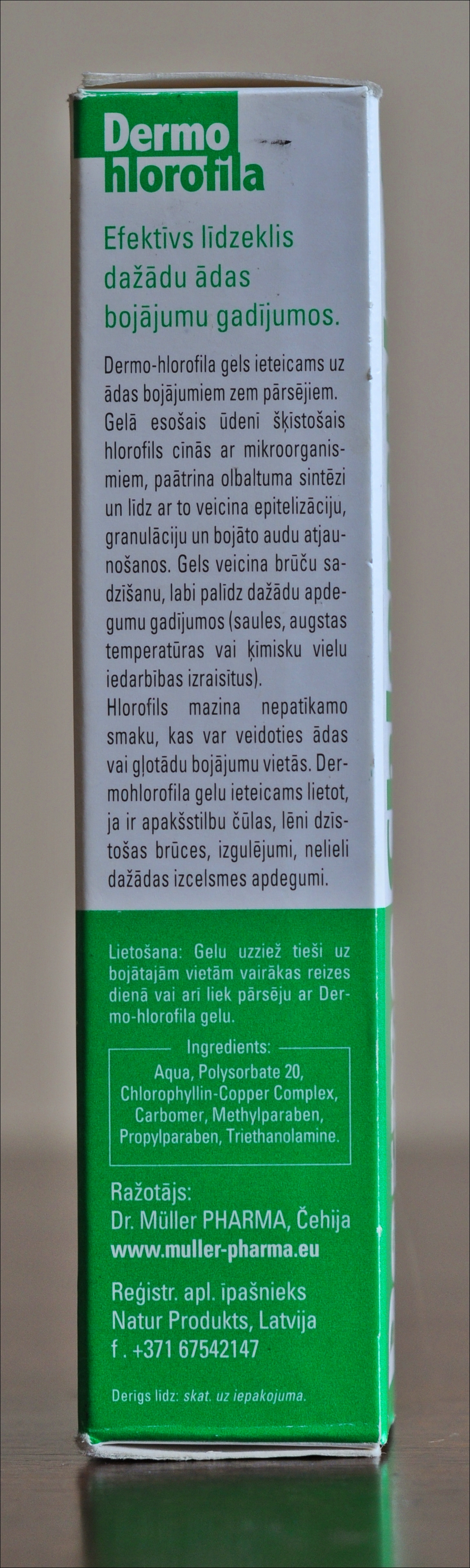 Pirms kāda laika tiku pie dažādām brūcēm uz rokām, kuras negribēja dzīt ar maniem ierastajiem līdzeļiem. Devos uz aptieku un tur man ieteica izmēģināt Dermo-hlorofila gēlu. Lai gan, uz iepakojuma lielākoties rakstīts, ka gēls palīdz sadziedēt apdegumus, tagad to lietoju visur – griezumi, tulznas, nobrāzumi utt.