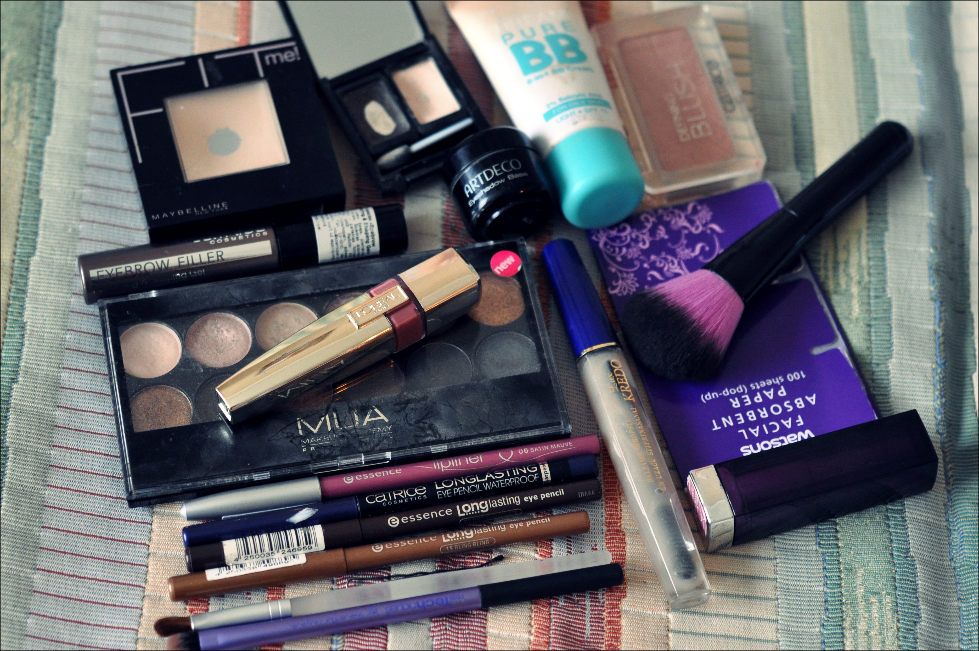 Man parasti līdzi ir tās diena lūpu produkts, konsīleris (ja nu kas) un baltais acu zīmulis(arī ja nu kas) un, protams, matu gumijas, ķemme, roku krēms, sejas krēms.. vispār viss tiek ņemts līdzi ar domu ”ja nu kas”, bet beigās es izmantoju tikai lūpu produktu un dažreiz roku krēmu..:)